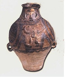 A la fin des années 70, dans le nord ouest de la Chine, sur le site de Liuwan, les archéologues ont découvert plus de 1500 tombes datant d'environ 2500 à 3000 avant JC. Ils ont, entre autre, mis à jour de très nombreuses poteries dont certaines chamaniques. Le personnage sur la poterie ci-dessus représente un chamane (WU) en position de méditation. Le chamane, homme ou femme, est l'intermédiaire entre le ciel et la terre et réunit en lui les principes féminin (terre) et masculin (ciel).
