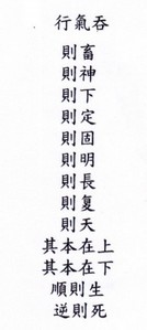 Pour faire circuler votre Qi, vous devez respirer profondément.Quand vous avez amassé suffisament de Qi dans vote corps, conduisez le qi vers le bas, faites une pause pendant un instant, puis utiliser votre esprit pour installer le qi dans le réchauffeur inférieur. Puis expirer lentement le Qi comme le germe d'une plante en train de se développer en montant jusqu'au sommet (par rapport au mouvement du qi qui descendait, sa remontée peut être considéré comme un retrait). Continuer à expirer lentement jusqu'à que le qi pathogène soit sorti de votre abdomen. De cette façon, le secret du ciel monte.